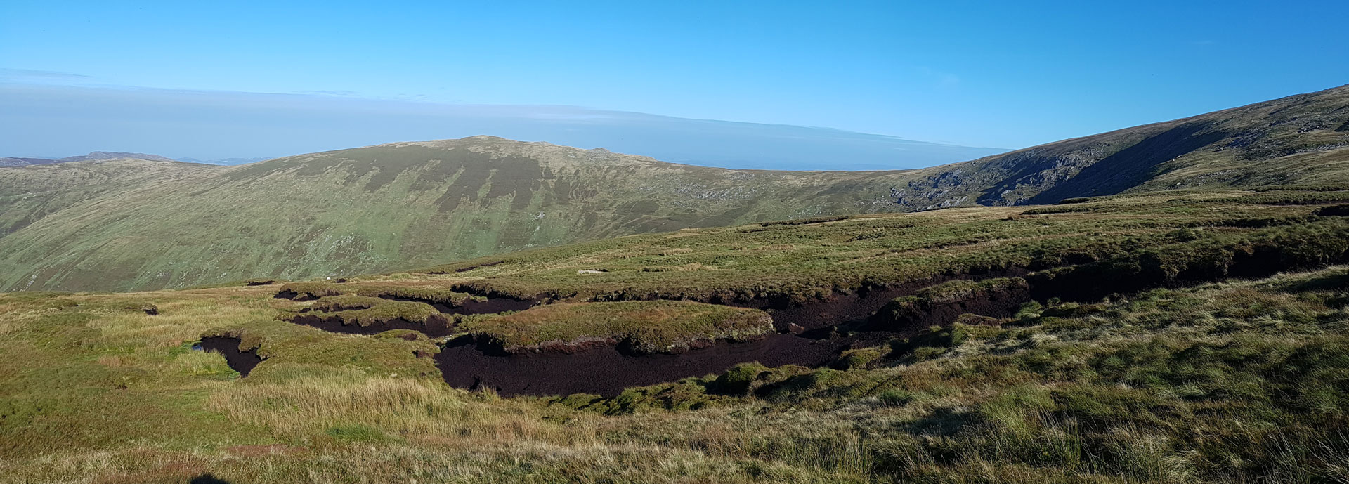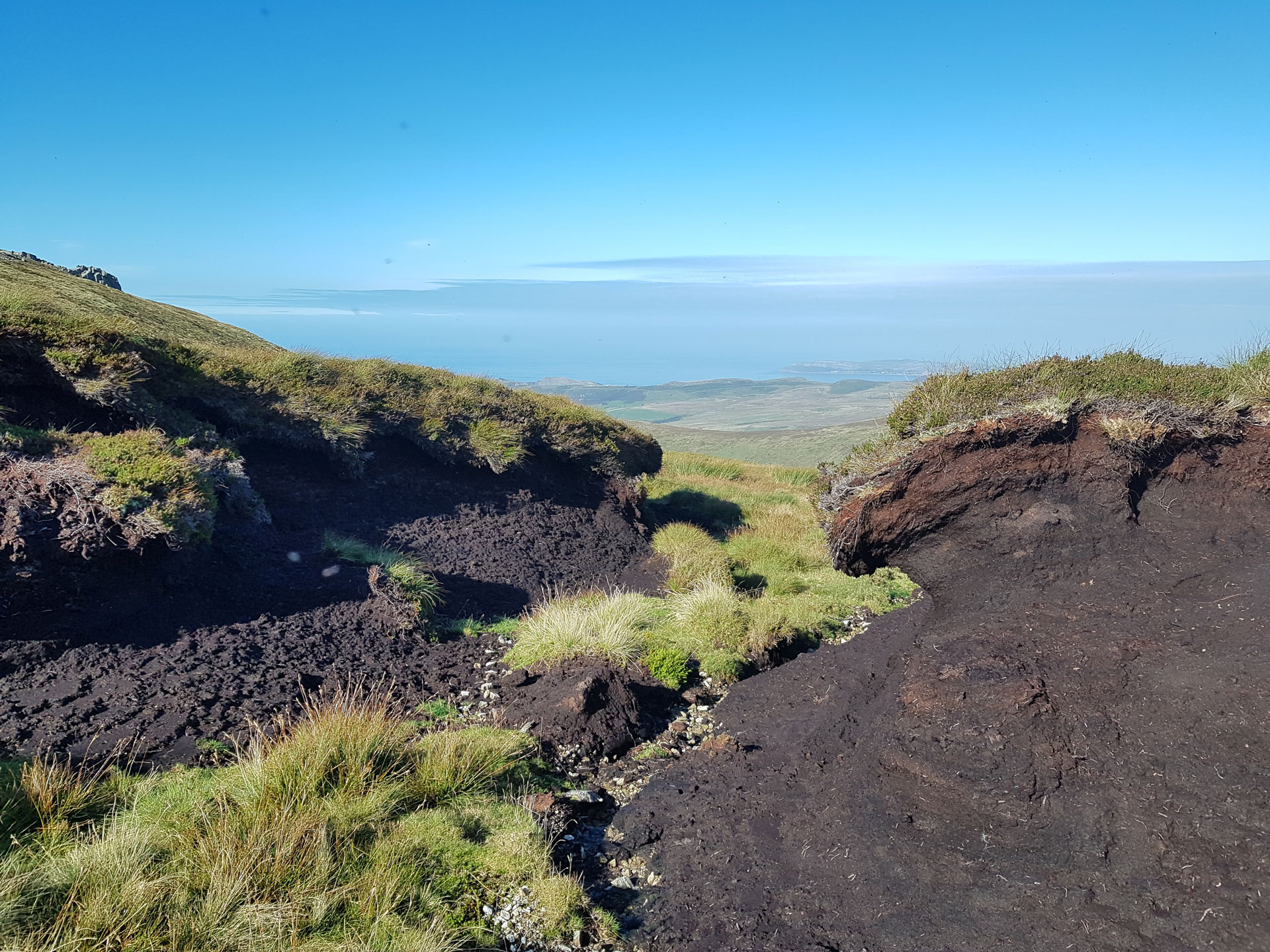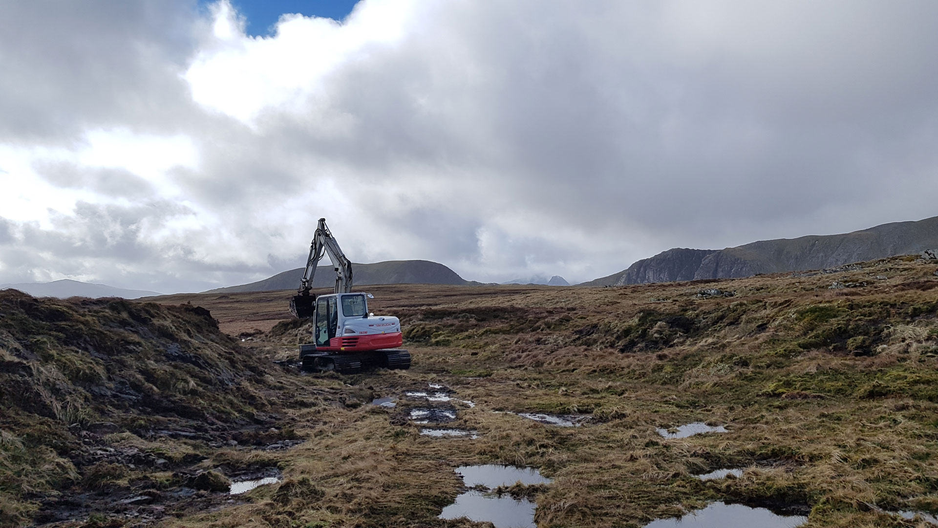 Mae adfer mawndir yn cynnwys sefydlogi ac ail-orchuddio ardaloedd o fawn sydd wedi erydu â llystyfiant. Dyma ddigar yn Llwytmor, Gorllewin y Carneddau, yn adfer ardal fawr sydd wedi’i erydu’n ddrwg drwy leihau llethr serth y cloddiau o fawn agored, a’u gorchuddio’n ôl â thyweirch. Bydd hyn yn helpu sefydlogi’r cynefin ac yn sicrhau nad yw’r mawn yn sychu ac yn rhyddhau carbon.