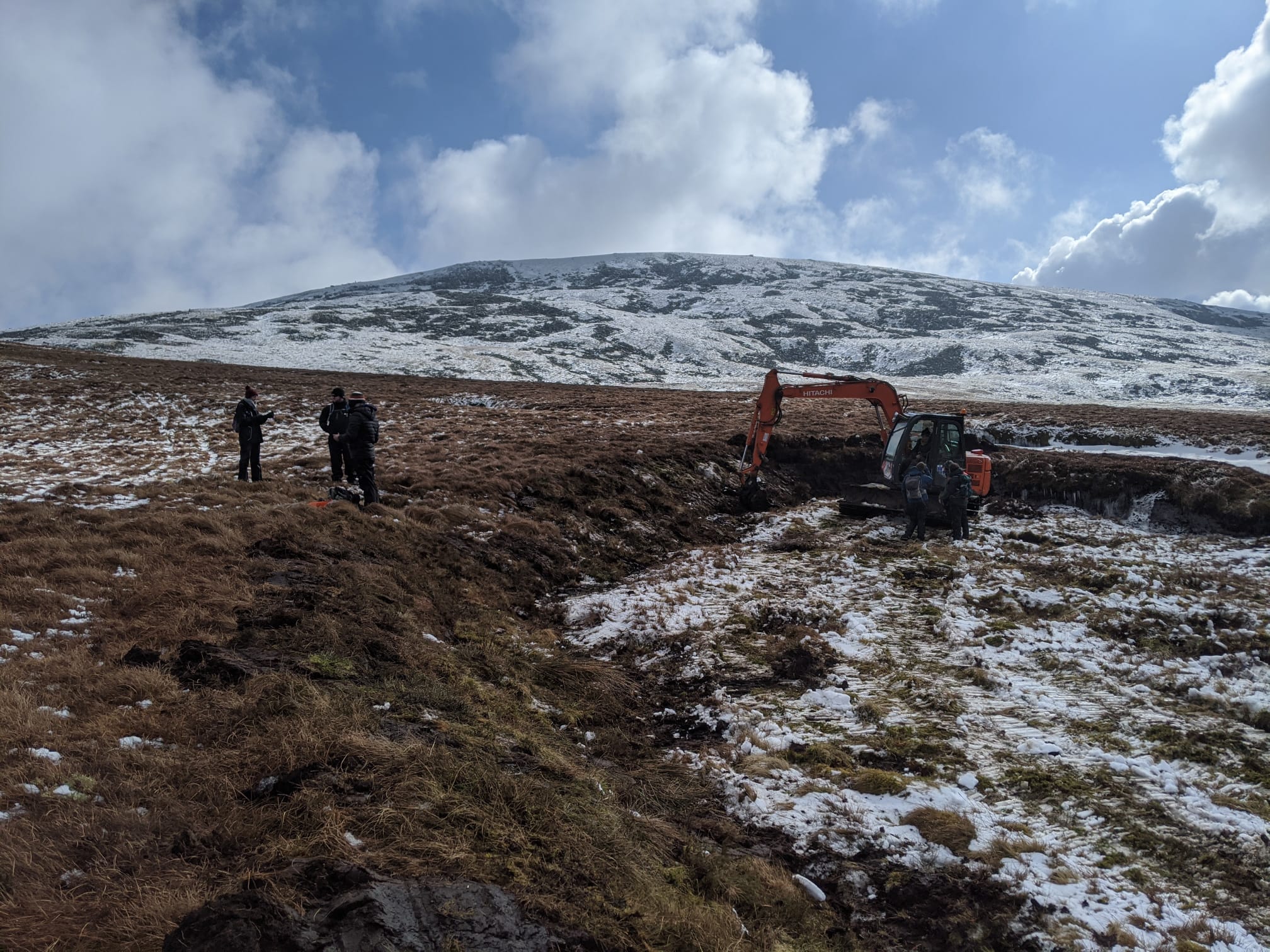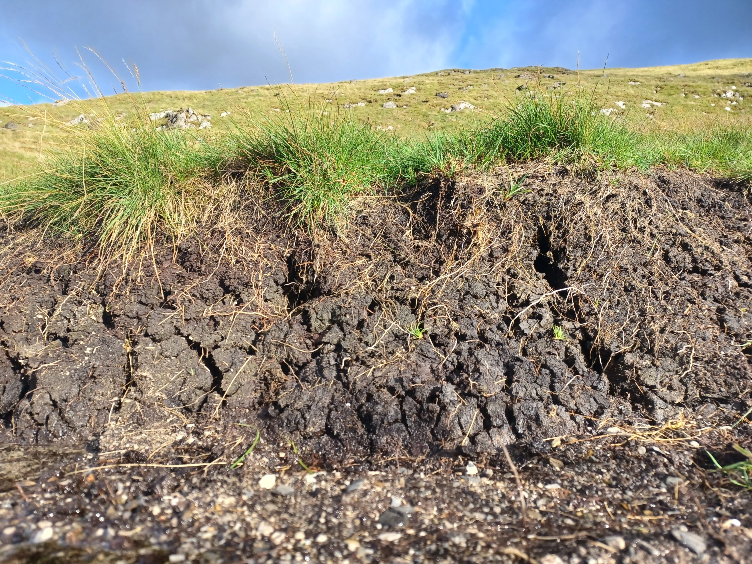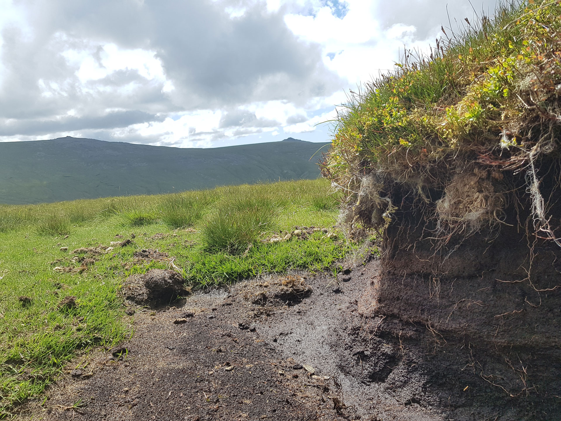 Mae adfer mawndir yn cynnwys sefydlogi ac ail-orchuddio ardaloedd o fawn sydd wedi erydu â llystyfiant. Dyma ddigar yn Llwytmor, Gorllewin y Carneddau, yn adfer ardal fawr sydd wedi’i erydu’n ddrwg drwy leihau llethr serth y cloddiau o fawn agored, a’u gorchuddio’n ôl â thyweirch. Bydd hyn yn helpu sefydlogi’r cynefin ac yn sicrhau nad yw’r mawn yn sychu ac yn rhyddhau carbon.